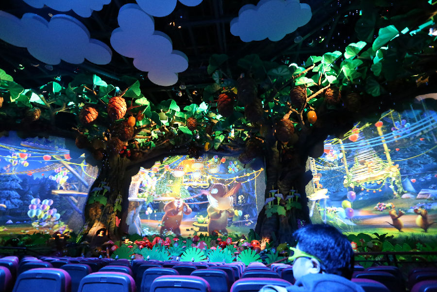 《熊出没剧场》中的座椅设置在大型旋转平台上,平台前后有两组可展示不同内容的大屏幕。随着情节演变,游客们将在两组屏幕的自由转换中观赏影片。综合实物景观和大型机械动作模型的环境4D剧场,结合烟雾、光电等多种特技,通过这些创新前卫的形式演绎引人入胜的剧情,《熊出没剧场》让游客们走进一个有声、有色、更有真实感的“熊出没”童话,一同感受纯真,体验美好,分享笑声。不仅如此,故事还巧妙地传递自然、环保、健康、快乐的理念,寓教于乐,让大朋友与小朋友们都能收获满满。