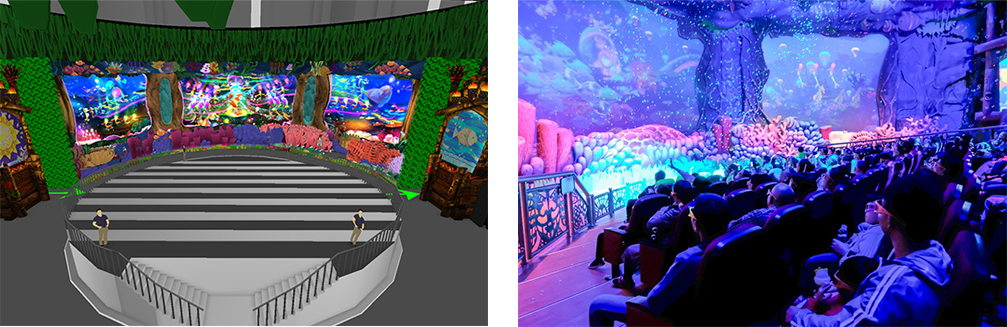 This large rotating environmental 4D theater integrates live action scenes, simulation technology, multiple screens, 3D effects, and relevant special effects. The theater is the first of its kind to use the screen frame switch method for scenes in a fixed location. As the platform rotates, audiences view new scenes and stories which are enhanced by stage props around the screen.
