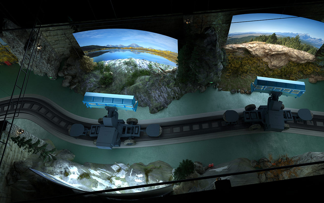 抓举式动感轨道车项目采用大型摇臂轨道车、球幕与环境场景相结合。其中轨道车辆采用了抓举式多自由活动的技术,可以根据剧情做出旋转、上升、下降等多个动作,可以模拟很逼真的飞翔感。